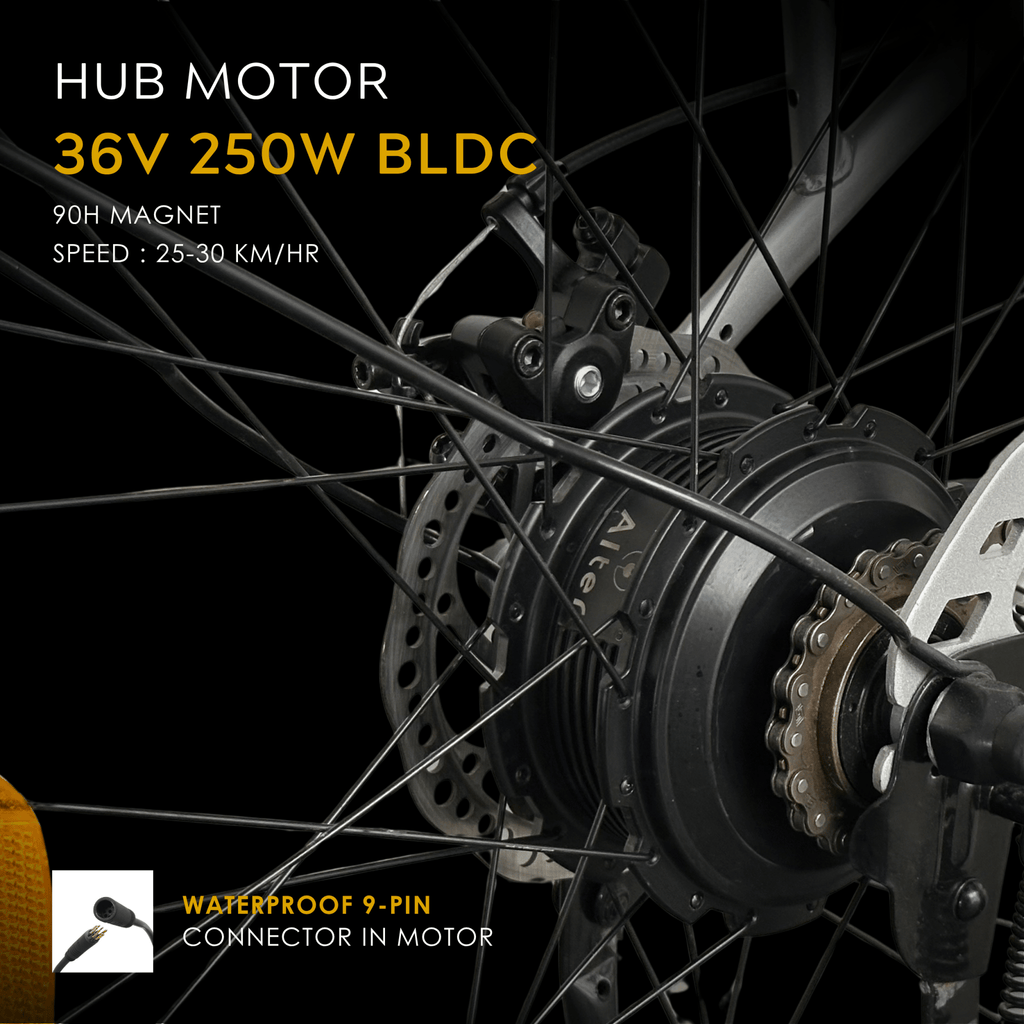 • HUB MOTOR : 36V 250W BLDC HUB MOTOR WITH 90H MAGNET, SPEED : 25-30 KM/HR, WATERPROOF 9-PIN CONNECTOR IN MOTOR.