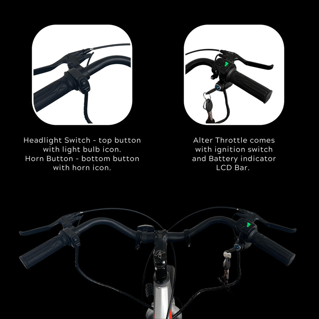 • THROTTLE : ALTER THROTTLE COMES WITH IGNITION SWICTH AND BATTERY INDICATOR LCD BAR.HIGH QUALITY TRANSISTORS USED IN THROTTLE FOR LONG LIFE.