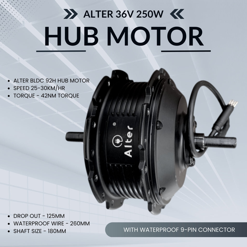 🚲 36V 250W BLDC HUB MOTOR 92H MAGNET, SPEED - 25-30KM/HR, 42NM TORQUE.ALTER MOTOR COME WITH 9-PIN WATERPROOF CONNECTOR (THAT IS EASY TO INSTALL AND EASY TO SERVICE).